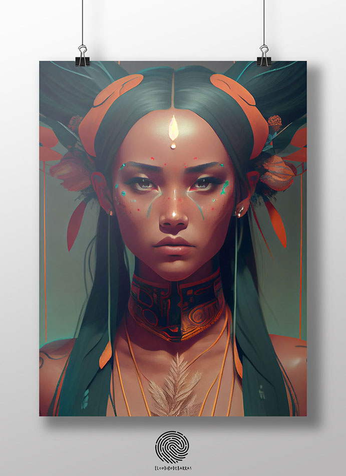 The image shows a stunning native woman with smooth, caramel-colored skin and prominent features. She has piercing eyes and thin lips, and wears her hair in two traditional braids that fall down both sides of her head. She wears a colorful feather ornament and her posture conveys pride and strength. Overall, the image captures the beauty and cultural heritage of a hypothetical futuristic native woman.