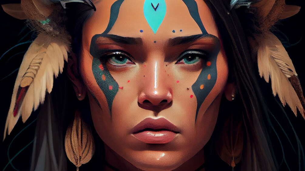 Beautiful Native American woman with long, flowing hair and piercing eyes. Wear a headband adorned with feathers and a birds. Earth colors, with shades of caramel used to highlight the woman's features and bring the image to life. The overall effect is a stunning and detailed portrayal of a strong and proud Native Woman.